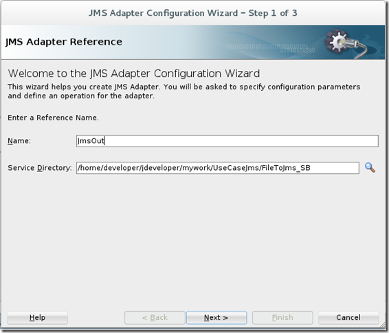 The JMS Adapter configuration is quite similar to the description in the section ‘BPEL consumes msg with JMS Adapter’, The list below indicates what has to be entered on the Wizard pages: