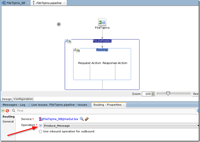 To get it to work, there is still one thing to do in the FileToJms pipeline. By default, in the Routing the Operation is set to ‘Use inbound operation for outbound’. That needs to be changed to ‘Produce_Message’, i.e. the operation of the JMS Adapter.