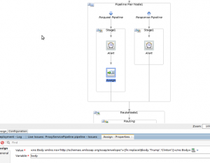 As you can see, this causes stuck threads. In order to get a {http://schemas.xmlsoap.org/soap/envelope/}Body you can for example use an Assign activity. In this case I’m replacing text in the input body and assign it to the output body. I’m using <ns:Body xmlns:ns=’http://schemas.xmlsoap.org/soap/envelope/’>{fn:replace($body,’Trump’,’Clinton’)}</ns:Body>. This replaces Trump with Clinton.
