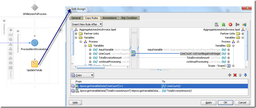 The final activity in the BPEL process is the processing of the Invoice Line. In this case, the processing is nothing more than adding one to the LineCount and adding the incoming invoiceAmount to the TotalInvoiceAmount variable.