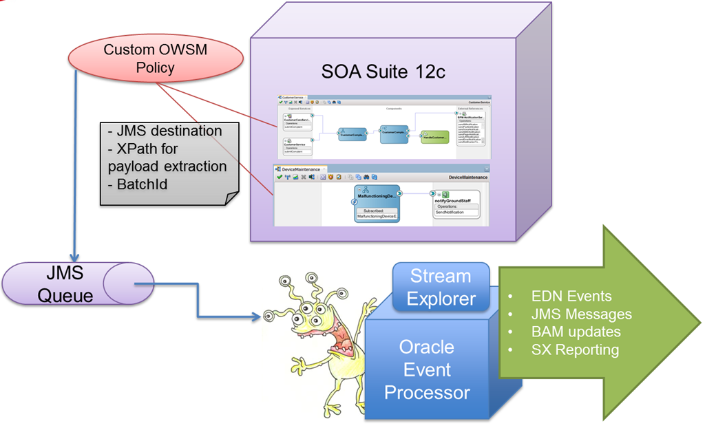 Custom assertions can be used in policies that are applied to web services. Depending on the type and configuration of the policy and assertions, they can be triggered at different moments and perform different tasks. These assertions are similar to aspects (in AOP) that take care of cross cutting concerns and that do not interfere with the internals of a service. Policies are attached (and detached) at runtime by the administrators. The assertion discussed in this article is to be attached to the service binding at the inbound end of a SOA composite application (or at a Service Bus proxy service that serves the same purpose). The assertion will report every incoming request as well as each response returned from the service binding. This information can be leveraged outside the scope of this article to monitor the runtime service environment.