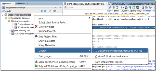 The main part of the custom assertion definition is a Java class. See for details the sources that can be downloaded from GitHub.The project contains a helper class – CustomAssertion – that takes care of some generic plumbing that are required for the AssertionExecutor superclass that needs to be extended. The class SOASuiteServiceExecutionReporter contains the custom logic that is to be executed whenever the policy assertion is triggered. In the current case, this logic consists of retrieving some key elements about the service request – service name, operation name, ECID, timestamp and selected payload details – and reporting them. Initially, this report consists of a few lines in the system output (i.e. the domain log file). Later on, we will send the report to a JMS destination.