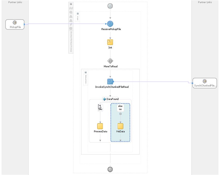 Reading files using SOA Suite is very easy as the file-adapter is a powerfull adapter. However, processing of large files is less trivial. You don’t want to read the huge file into memory and then process it. Preferable you process it in smaller chunks. Chunking the file using the “Read File” option of the file-adapter is pretty staight forward, all you need todo is to specify the publish size. Working with chucks for the “Synchronous Read File” option used from BPEL is less easy. In this blog I’ll describe how to implemement processing of a large file using BPEL and the “Synchronous Read File” option from the file adapter. This blog describes the processing of large CSV files, for processing large XML files see Processing large XML files in the SOA Suite.