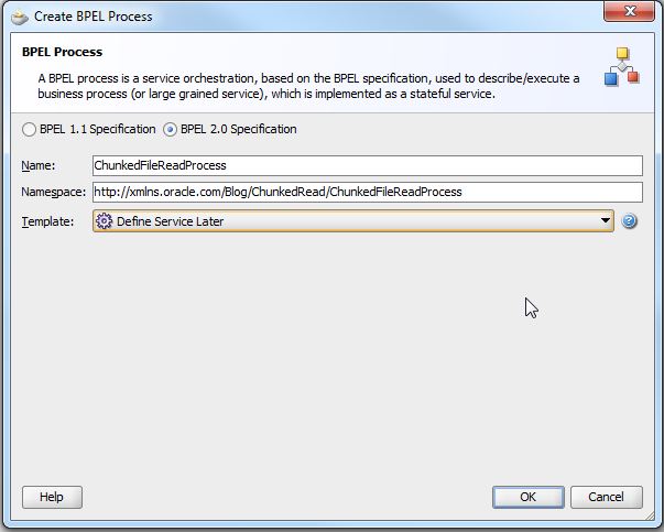 - In the wizard, change to BPEL 2.0 specification, name it “ChunkedFileReadProcess”, template “Define Service Later” and press OK