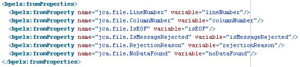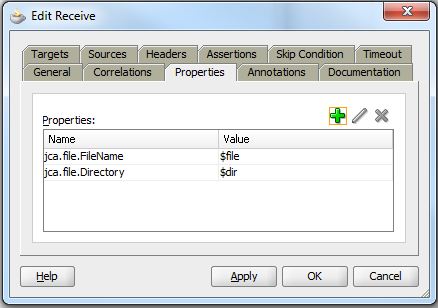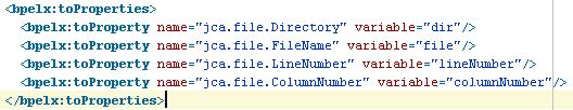 - Goto the properties tab, add two properties to get the jca.file.FileName and jca.file.Directory from the adapter. Store these values in the corresponding variables.