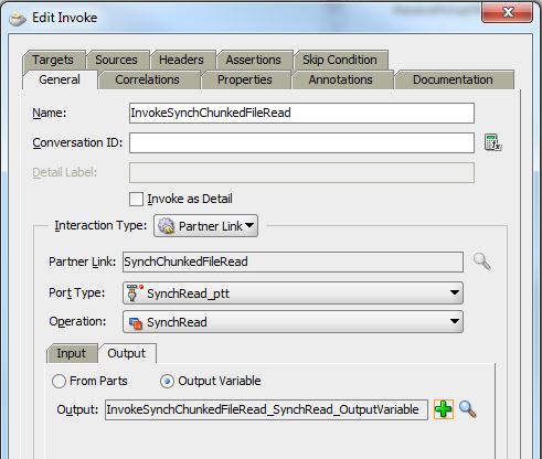 - Inside the loop drag an “Invoke Activity”, open the properties and select “SynchChunkedFileRead” as partnerlink. Name the activity “InvokeSynchChunkedFileRead”. Auto create the input and output variable using the + sign.