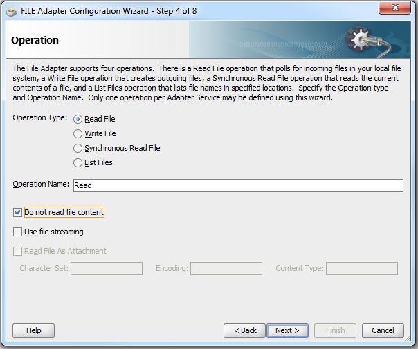 In this blog we will create a compostite which will process a “large” file, in this case not really big but big enough to demostrate all the essential steps. A file adapter should start the BPELprocess, this process must read this file in chunks. For each chunk an action must be performed, after all the chunks are processed, the BPEL proces is done. We use the Read option from the file adapter to start the BPEL process, but this Read operation should not read the content. We configure a second, Synchronous Read File, adapter to read the content of the file in chunks. Each chunks is then processed individually.