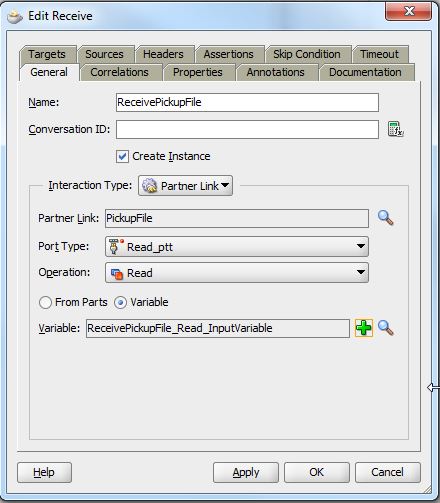 - The BPEL process should start when the file specified in “PickupFile” is picked up by the adapter, add a recieve activty to the process and open the properties. Name it “ReceivePickupFile”, select “PickupFile” as partnerlink. Tick “Create Instance” and autocreate the inputvariable.