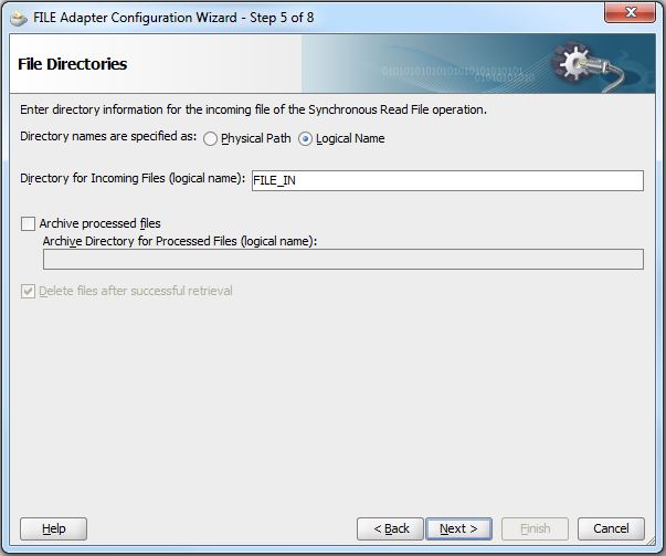 - Select directory name = Logical Name. Name it FILE_IN, Next. Make sure not to select the delete file option