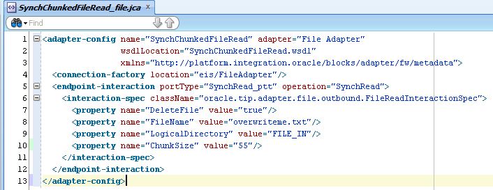 So far we just created a file adapter doing a synchronous read, now let’s modify it so it will read the file in chunks. This is done by modifying the SynchChunkedFileRead_file.jca file. You’ll find this file in the project explorer. Open this file. Change the classname for the interaction-spec to “oracle.tip.adapter.file.outbound.ChunkedInteractionSpec”. Also add a property to specify the chunksize, for now we use 55 “<property name=”ChunkSize” value=”55″/>”. The file should look like this.