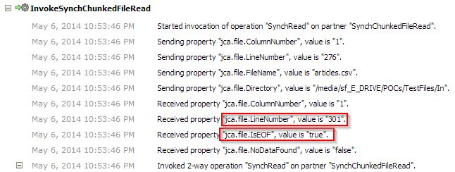 Click on the bpel process instance, look at the invokation of the SynchChunkedFileRead in the first loop. You’ll see all the properties being exchanged. As expected, IsEOF is false, and we’ve read until line 56. Scroll down to the bottom and look at the invokation of the SynchChunkedFileRead in the last loop. As expected, IsEOF is true, and we’ve read until line 301.