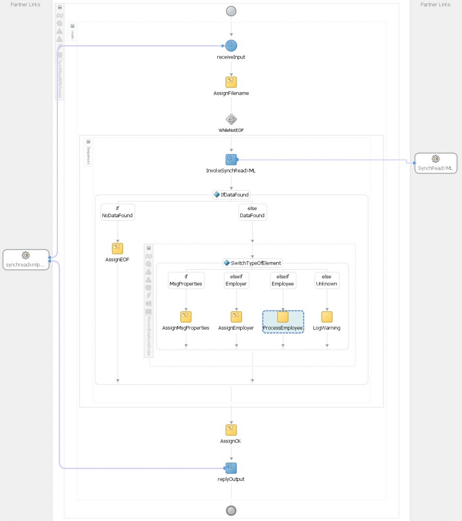 Finally we have to adjust the logic in BPEL by looping over the read elements. Based on the type of element, with expression local-name($InvokeSynchReadXML_SynchReadXML_OutputVariable.body/*[1]) = ‘MsgProperties’, we decide what to do. Assume that for processing one Employee element, also the information of both the MsgProperties element and the Employer element is needed. So in case the MsgProperties is read, we store the information in a MsgPropeties variable and the same applies for an Employer element (in an Employer variable). When an Employee element is read, we can use these variables to complete the data for processing an Employee. The flow now looks like this: