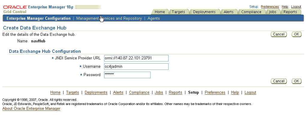 - Provide the JNDI Service Provider URL for the Data Exchange hub. The portnumber should be the opmn remote port number.