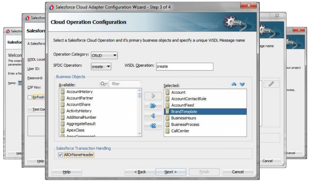 The Salesforce.com adapter has the same global features as described above, but also has support for standard and custom Salesforce objects, SOAP API using Partner WSDL & Enterprise WSDL and Salesforce’s own Query Language (SOQL) & Search Language (SOSL). The adapter uses the Oracle Credential Store Framework to store user credential and supports the adapter diagnostic framework for reporting and alerting.