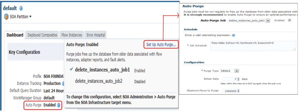 Purging of instance data is an important part of SOA Suite maintenance. In 12c Auto purge of SOA DB is enabled by default for new installations. Purging of the SOA DB can  now be scheduled through the enterprise manager, which uses Oracle DB schedular. There is improved performance due to the new DB schemas which consolidate Audit and Flow instance data and eliminates orphaned instances. 12c supports Interval Partitioning which accelerates purging by targeting tables/instances within a time range.