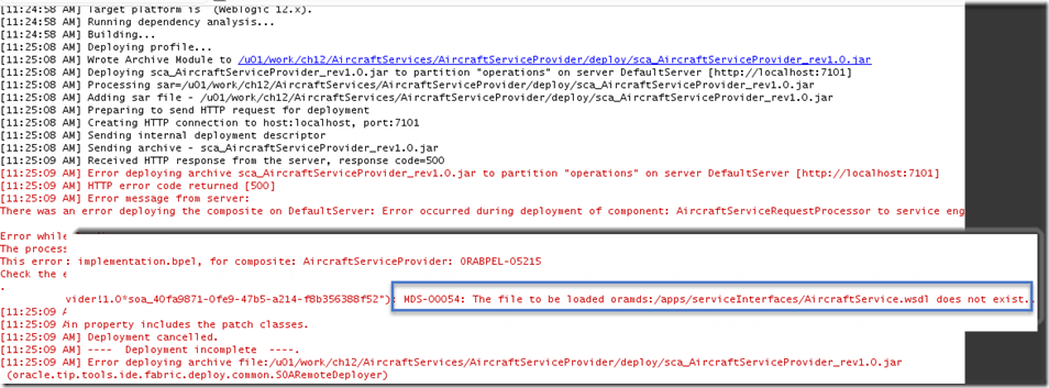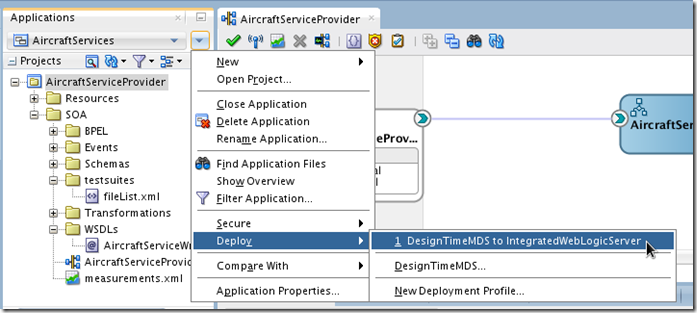 The starting situation is the following: a SOA composite that references the file AircraftService.wsdl that is stored I the Design Time Repository. The reference in the SOA composite application will use the oramds: prefix, indicating that the artifact is in fact to the found in the MDS repository. However, the run time MDS associated with the target SOA Suite run time environment, does not yet contain this WSDL document. The next figure shows on the right side both the design time MDS and the run time MDS (see this article on how to expose the run time MDS in the Integrated WLS in the Resource Palette).