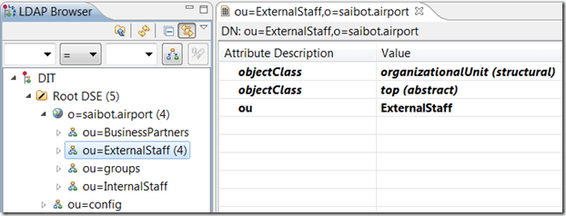 the baseDN (the tree under which the search should be executed) is set to the ExternalStaff “folder” in the saibot.airport “partition”