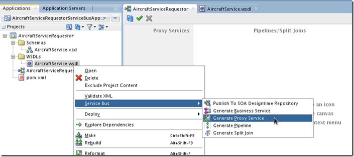 Based on the WSDL, we can for example start to create a proxy service. Note that from this point on, there is no link at all between the WSDL resource and the MDS repository.