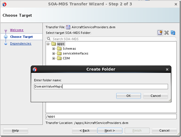 The SOA-MDS Transfer wizard opens – to have us select the target folder and the dependent resources to bring along.