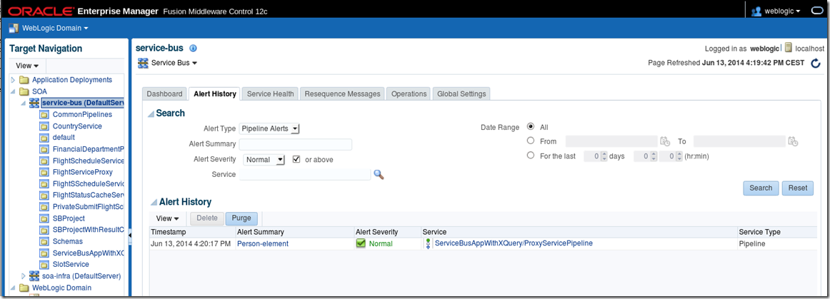 In SOA Suite 12c, the Service Bus console no longer exists. The Service Bus specific run time browser interface is not intended for administration activities: all administration around SOA Suite 12c is consolidated into Enterprise Manager Fusion Middleware Control. So a valid question now becomes: how to locate pipeline alerts produced in 12c Service Bus run time environments? These are of course to be found in EM FMW Control. But where and how exactly?