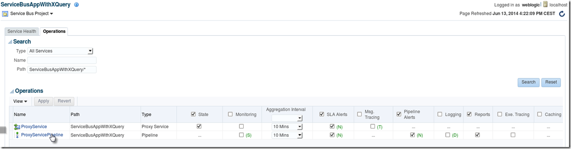 The next step is to run the pipeline or the proxy service. In both instances, the service is deployed to the Service Bus run time engine in the Integrated WLS.