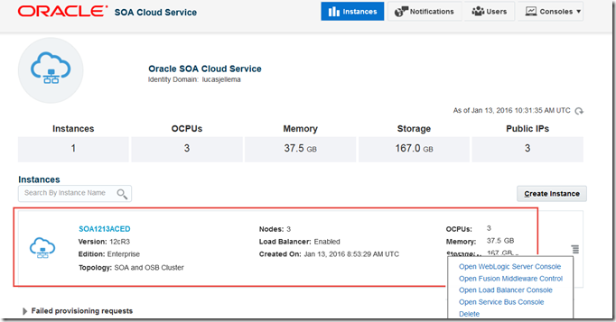 You will note the JCS instance – SOA1213ACED-jcs – that has been created automatically to host the SOA Suite. Three compute nodes are created on the Compute Cloud Service, one for the Load Balancer and two for the two managed servers on which Service Bus and SOA SCA engine (and the technology adapters) run. In addition to the storage containers already prepared for the DBaaS instance and the SOA CS backup, additional storage containers have been created automatically to support the compute nodes.