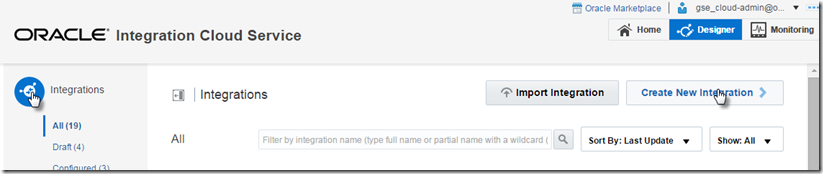 You will see how I have to first create two connections. Connection is the ICS term for an external link – either outbound from ICS to target systems (comparable to business services in Service Bus or a Reference in SCA composites) or inbound into ICS (from external consumers), similar to Proxy Service in Service Bus and Service in SCA composites. One connection is outbound, to the third party service that does distance conversions. The other connection is inbound – it describes the SOAP interface that I want to expose from ICS to my consumers.