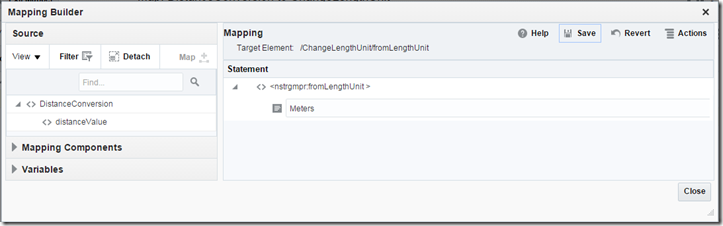 The mapping editor appears. Drag the distanceValue element in the source to the LengthValue element in the target. Click on the fromLengthUnit element in the target and enter the string Meters on the mapping builder details page that appears: