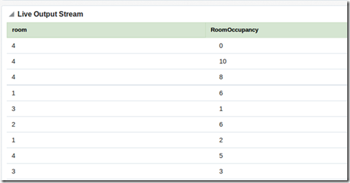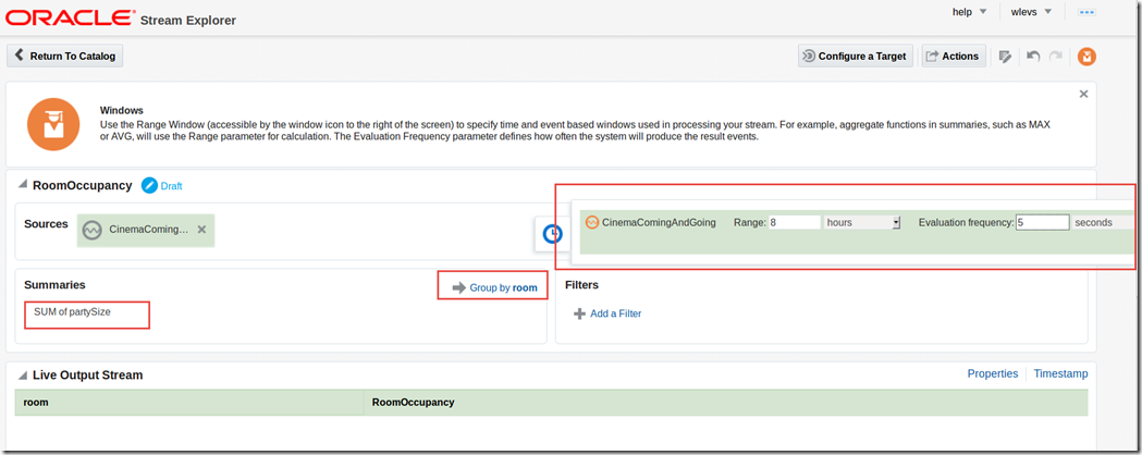 The events are aggregated grouped by room. The aggregation to be calculated is a sum over the partySize. This should produce the total number of people in every room. In this case, I have also chosen to have the summary calculated once every 5 seconds and to include in the results only the events from the last 8 hours (which is quite arbitrary).
