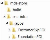 | Create a directory mds-store in the root of you’re working copy (preferred a part of a SVN of GIT repository).Create two directories within the mds-store folder, build and soa-infra.build folder contains build en configuration files to deploy a local MDS to a remote MDS. The soa-infra folder is the seed folder and will contain the main structure where the xml-based files resides in.In the seed folder there always needs to be a apps directory. Within this apps folder create one application folder of each mayor application that uses the same definition. |