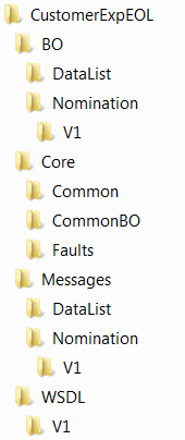 | How the internal structure of an individual app looks like is up to the person that designs the service contracts, but for use the upcoming example I will show you the structure that was used on my last project.Per BO there is a subfolder with the name of the BO. Per version there is another subfolder. A new version begins if the structure is really different and not compliant with previous version. The filename of the XSD is the same as the BO.The Core folder has three subfolders; Common and CommonBO and Faults.In the Common folder XSDs reside that holds common types and elements and metadata XSD for the service header and status types.In the CommonBO folder you will find BO that are used by others XSDs and are thereby reusable.