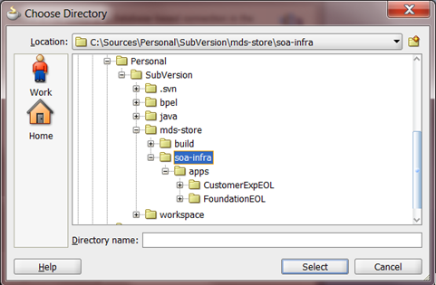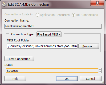 Select under Connection Type a File Based MDS for creating a connection to a local MDS and browse to the root of the MDS on your filesystem. The root of the MDS is the directory called mds-store and click on the seed soa-infra.