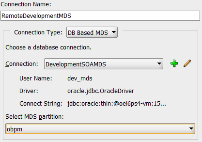 Select under Connection Type a DB Based MDS for creating a connection to a remote MDS. In the connection dropdown a list of database connections is presented. If you never created a connection to the remote MDS of your environment you won’t find the correct connection in the list. If so you need to create a new database connection to the MDS schema of your environment.