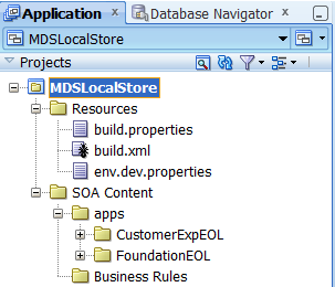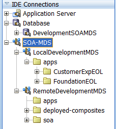 Both MDS connections are now configured and displayed in the Resource Palette under SOA-MDS. If you expand to the Local{Project}MDS and Remote{Project}MDS, you will that the have both different folders. The local MDS has two apps defined, but the remote MDS has an empty apps folder.