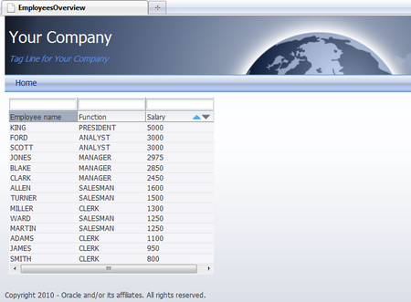 This article gives a very rapid demonstration of the creation of a new WebCenter Portal application with only default content. This application is deployed in the Integrated WebLogic Server. At run time, a new page is created as well as a new Data Control for Employee from the EMP table in the SCOTT database schema. A table visualization of the Employees is added – still at run time – to this dynamically created page.