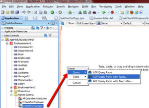 With this in place I create a simple taskflow with a pagefragment. The taskflow has an inputParameter called ‘startupMode’. The pagefragment contains a table with a query component. This is easy to create by dragging the Employees collection from the datacontrol onto the pagefragment and pick “query panel with table”.