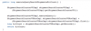In the executeQuerySearchShipmentsHitCount api, you have a getRecords() call on a ViewRowImpl.