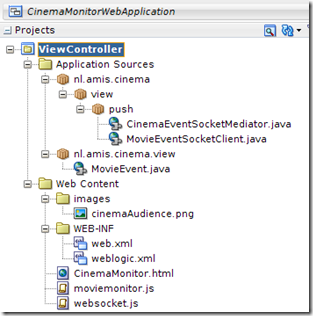 The imported JavaScript library websocket.js initializes the web socket connection to the end point ws://localhost:7101/CinemaMonitor/cinemaSocket. It configures JavaScript handlers for onOpen, onClose and onMessage. The latter is the most important one: any messages received on the web socket are checked for the string room. If the string is found, the message is handed off to the function updateRoomDetails(). This function is defined in the second JavaScript library moviemonitor.js.