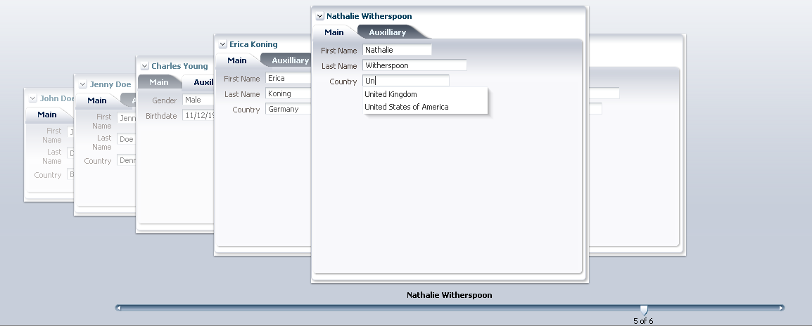 Here the effect of the autoSuggest behavior on the Country inputText. This too works inside the carousel: