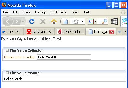 I created a very simple and granted ugly application to demonstrate a fairly generic mechanism that could be used for synchronizing the regions that are both based on bounded taskflows. If anyone happens to know a mechanism that is part of ADF 11g – I have not been able to find one – I would be very interested.