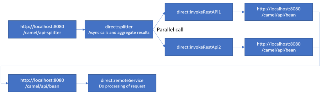 There is an object available to map the JSON request to in this example. You’re not required to map the JSON to a Java object but for processing inside your Java code, this can come in handy. The api-splitter calls a direct:splitter which creates two Futures do do the calls in parallel to the local api (which maps the JSON to a Java object and does some processing). The result when received is then parsed to JSON and the results from both services are merged in a single array. Below a small picture of how this looks.