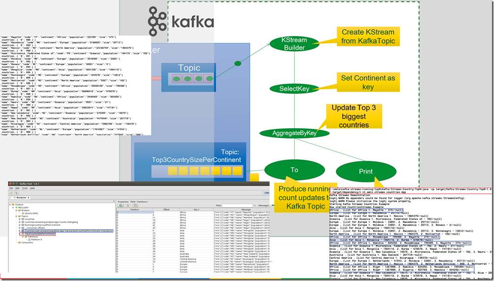 - Top3CountrySizePerContinent is the destination topic for the Kafka Streams application, to which the running Top 3 messages are produced