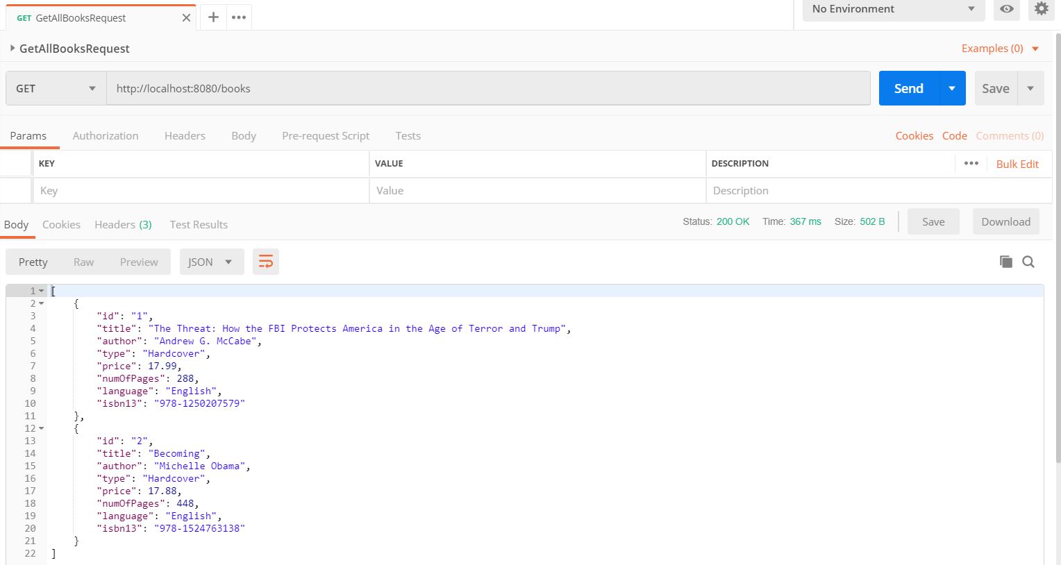 From Postman I invoked a request named “GetAllBooksRequest” (with method “GET” and URL “http://locahost:9090/books”) and a response with “Status 200 OK” was shown: