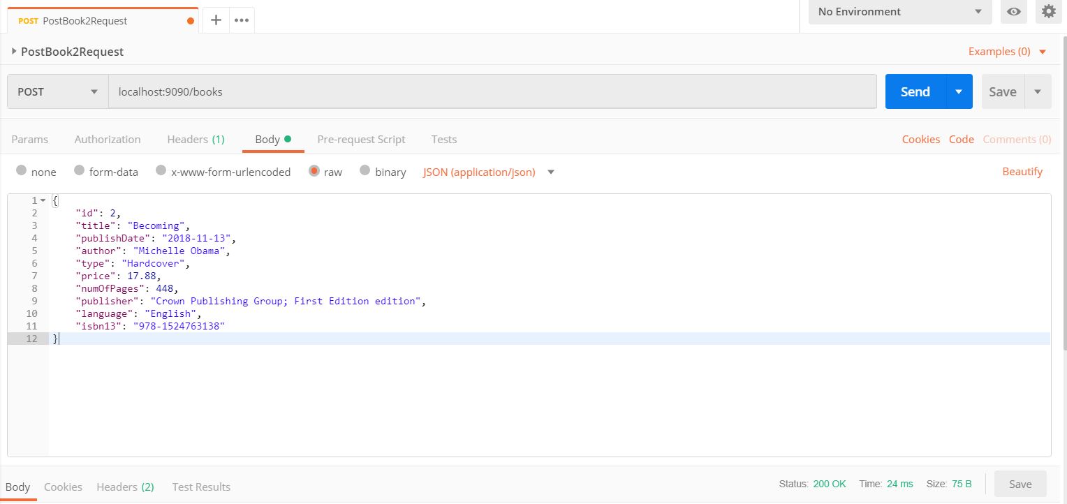 From Postman I invoked a request named “PostBook1Request” (with method “POST” and URL “http://locahost:9090/books”) and a response with “Status 200 OK” was shown: