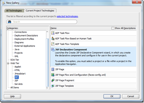 Open the New Gallery, open the JSF Node under the Web Tier and select the JSF Declarative Component option: