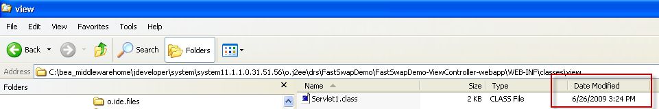 6. WebLogic Server will only be able to spot changed class files in the deployment directory where the web application has been exploded. You will have to locate the system11.1.1.0.31.51.56\o.j2ee\drs directory (the exact number sequence after system can vary with the exact version you are using); in that directory, you will find a directory that is named as your web application is, and inside that directory there is a webapp directory that contains WEB-INF with a classes subdirectory. That classes directory (in my case that is system11.1.1.0.31.51.56\o.j2ee\drs\WLSFastSwap\WLSFastSwap-ViewController-webapp\WEB-INF\classes) is where during deployment the application’s classes were deployed to and that is where WebLogic will check for hot swappable classes.