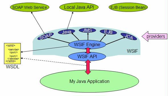 WSIF is an open-ended framework for invoking WSDL described services. As long as a WSDL description of the endpoint exists, it should be possible to use this framework to invoke that piece of software, whatever it may be. WSIF, an Apache technology originally developed by IBM alphaWorks as a part of its Web Services Toolkit, extends the Web services model by allowing you to describe services in WSDL, even if it’s not a Web service that communicates through SOAP. WSIF also allows you to map such a service to the actual implementation and protocol. In other words, you can bind the abstract description of any WebService-like service to a corresponding resource, which can communicate using one of the supported WSIF providers. WSIF supports WSDL descriptions for services offered by Java classes, EJB, JCA, HTTP GET and POST, and sockets. Oracle BPEL for example has extended the WSIF framework with a provider for PL/SQL procedure calls.