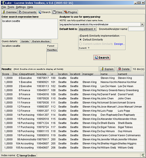 the documents in your index. In the search tab you can enter queries. Pick the StandardAnalyzer from the right
