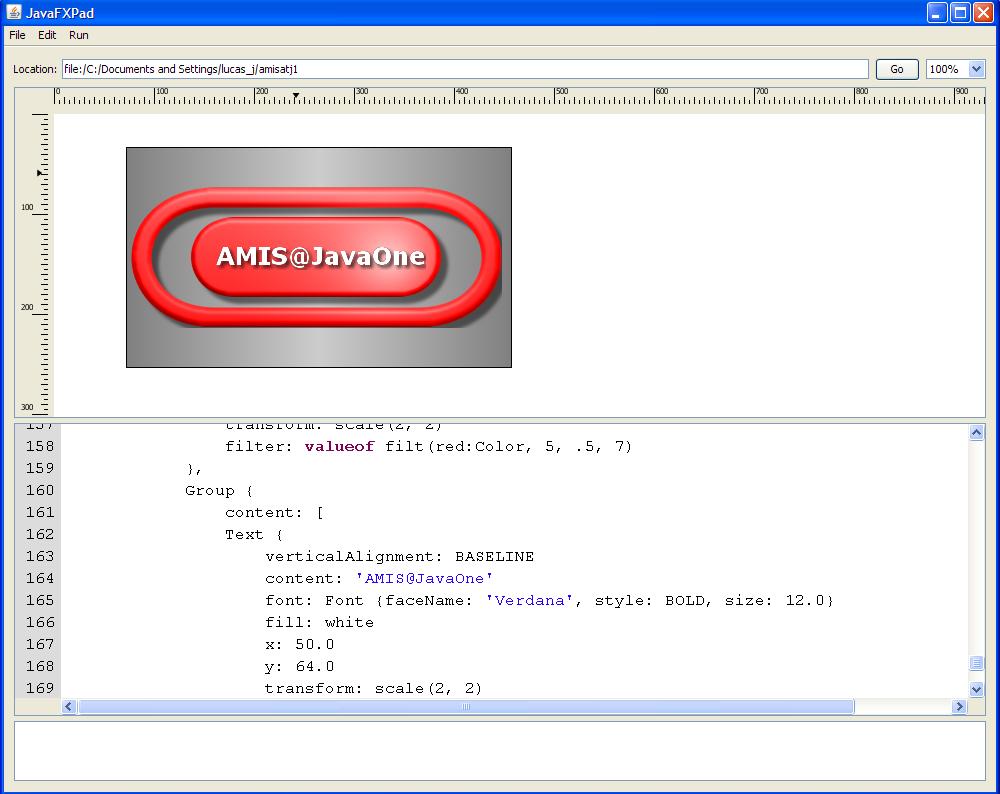 More information on JavaFX also found on James Weaver’s weblog: http://learnjavafx.typepad.com/ . He provides a number of examples that can be ran for example in the Pad shown above.