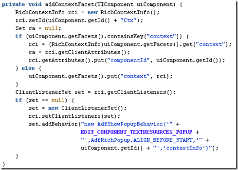 The method addPopupBehaviorOnUIComponent programmatically creates the equivalent of the <af:showPopupBehavior> component, associated with the text editor popup: